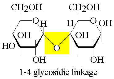 Properties of carbohydrates depends on how monomers are bonded together, usually by glycosidic linkage. Plants store starches, a polymer of glucose, used as fuel. Cellulose make up plant cell walls, and also uses glucose. But they have a slightly different ring structure. Starch (helical) = α configuration, cellulose (straight) = β configuration.